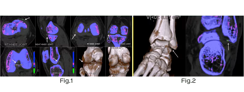 Keeping the dual energy ratio at 1.36, the uric acid crystals lie below the line and are differently color-coded (green), whereas the calcium deposits lie above the line. Hence diagnosis of gout can be easily made, non-invasively (Figs. 1, 2).